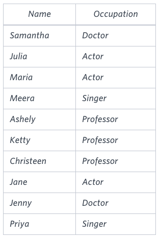 - 나온 결과로는 Actor가 직업인 사람은 Eve, Jennifer, Ketty, Samantha 총 4명