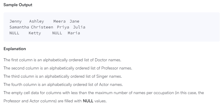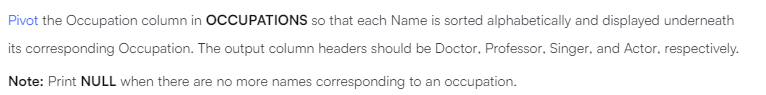 Pivot the Occupation column so the Name of each person in OCCUPATIONS is displayed underneath their respective Occupation.