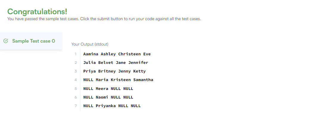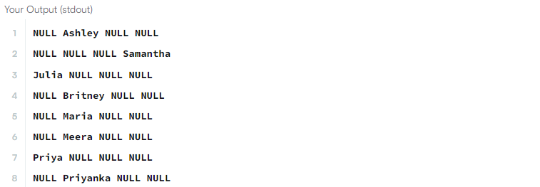 - EX) rn이 1인 Eve, Amina, Ashely, Christeen이 먼저 select문에 들어가게 되고 case when문을 거쳐 해당하는 직업 블럭에 들어가 name이 출력된다