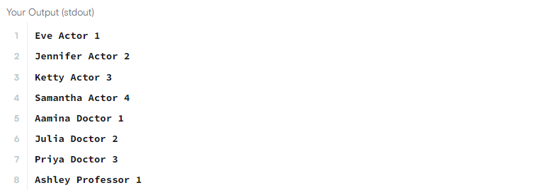- Ashley는 직업이 Professor 여서 doctor, singer, actor에서는 NULL값이 출력되고 professor부분에서만 이름이 출력되는 것을 확인할 수 있음