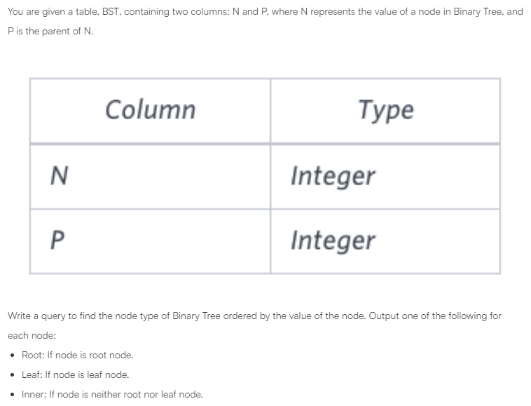 when N NOT IN (select DISTINCT P from BST where p is not null) then 'Leaf'