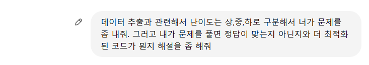 GPT에게 전처럼 문제를 내달라고 했고, 난이도는 상, 중, 하 구분하여 내달라고 하였다.