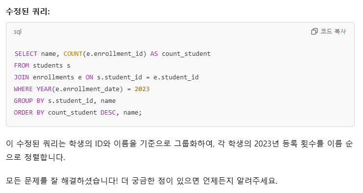 또한 집계함수를 사용할 때 student_id를 count해달라고 했는데 이때 student_id 앞에 별칭을 붙이지 않았다. 동일한 컬럼명을 가지는 경우엔 별칭을 통해 구분지어야 한다!
