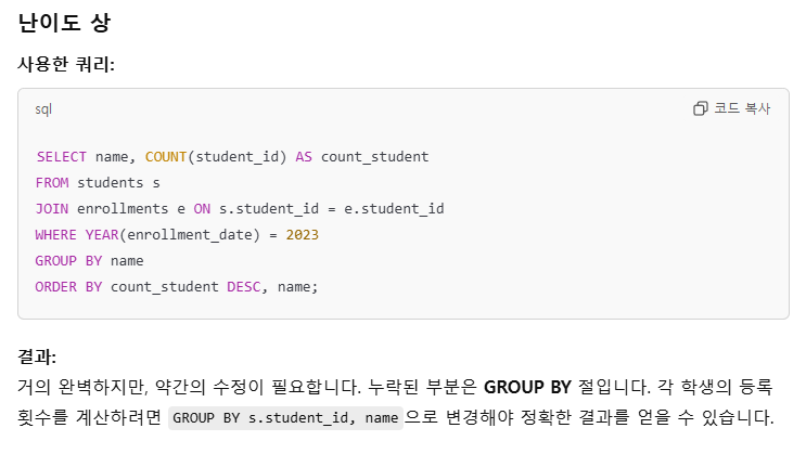 마지막 상 난이도에서 집계함수를 사용해놓고 group by를 하지 않는 실수를 했었다,, 위에서부터 순차적으로 코드를 적다보니 가끔씩 깜빡하는 거 같다. 조심 또 조심