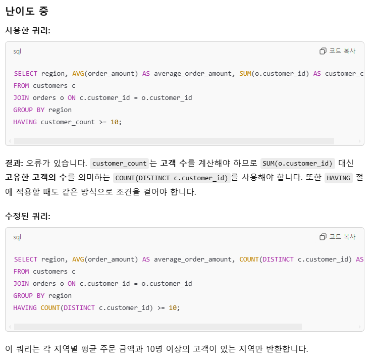 - having 절에는 total_sales와 같은 별칭을 사용해서 조건문을 걸 수 있지 않나? 왜 GPT는 별칭을 사용하지 않는걸까 라는 의구심이 들어서 찾아보았다.
