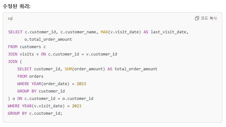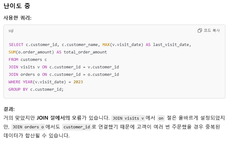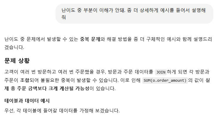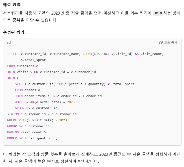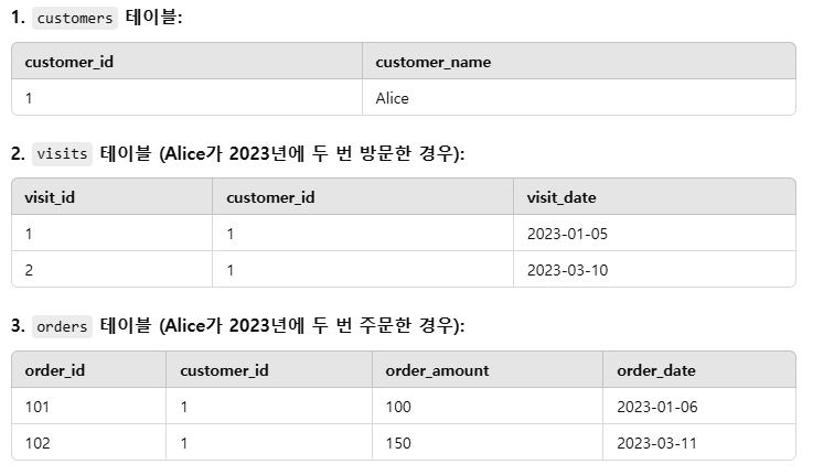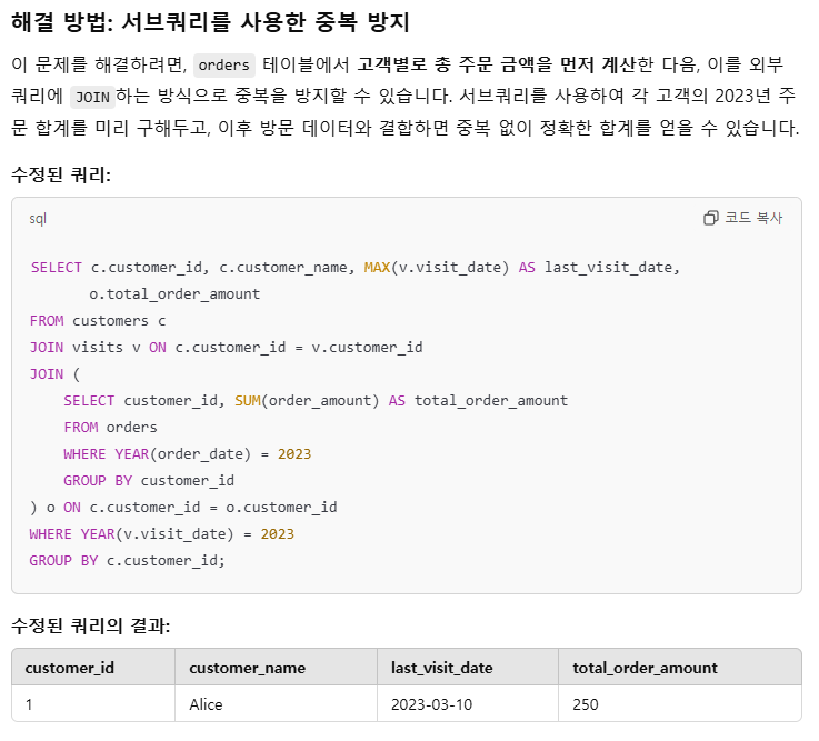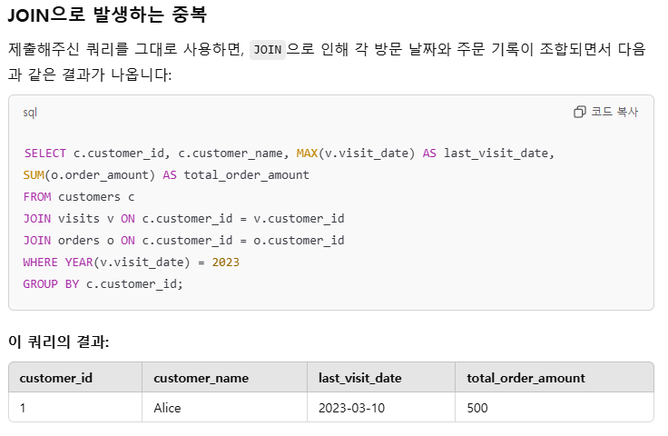 이 결과에서 total_order_amount가 500으로 계산된 이유는, JOIN으로 인해 각 방문 기록이 각 주문과 결합되었기 때문입니다: