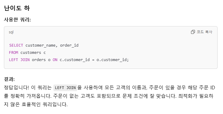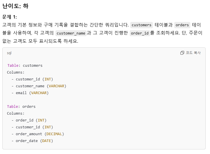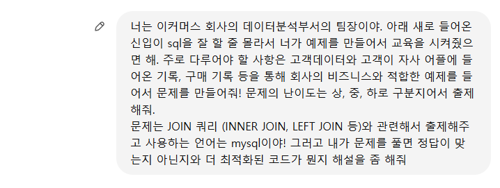 오늘은 JOIN 쿼리 (INNER JOIN, LEFT JOIN 등)과 관련하여 GPT와 함께 예제를 풀어볼 예정이다.
