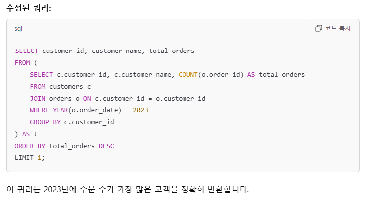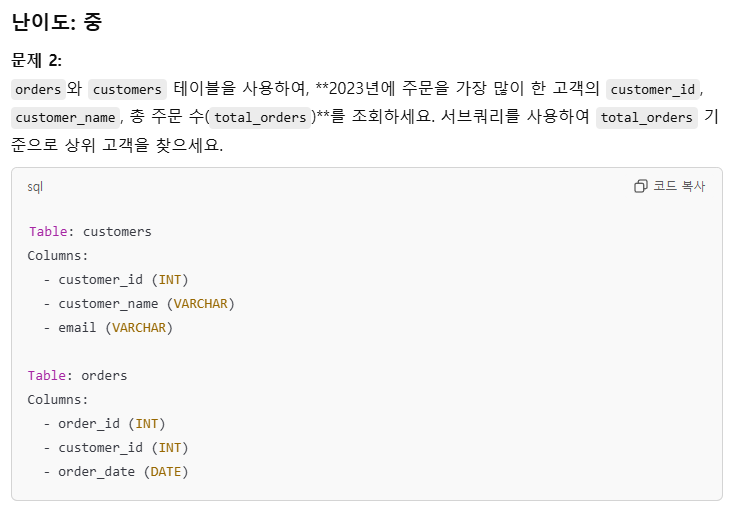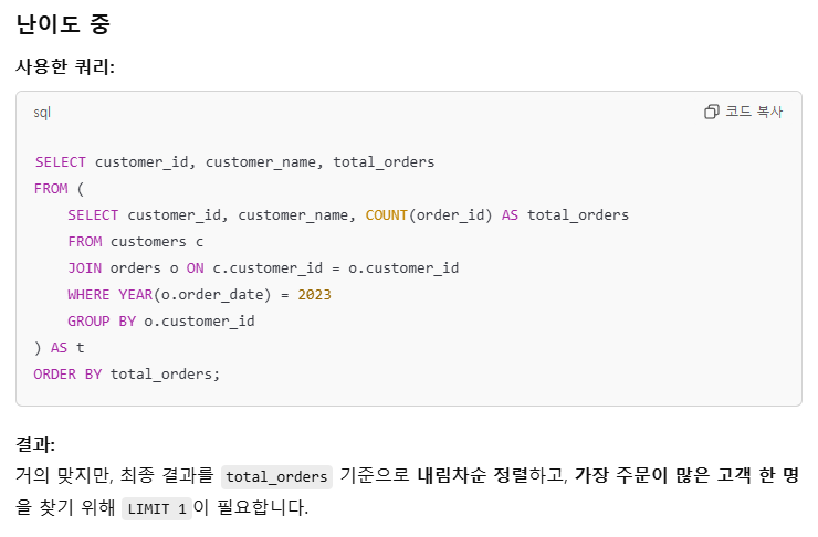 - chatGPT가 내주는 문제는 그렇게 정확도가 높은 거 같지는 않다. 난이도 중 문제도 상위 고객을 찾으라는 말 대신 가장 주문이 많은 고객 한 명을 찾으라는 말로 대신했으면 더 정확했을 거 같다는 생각이 든다.