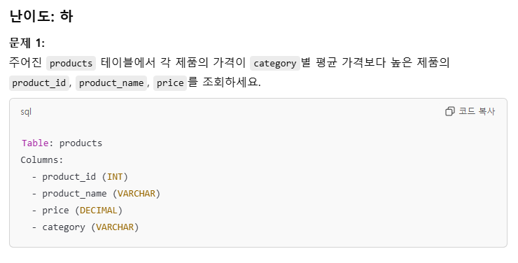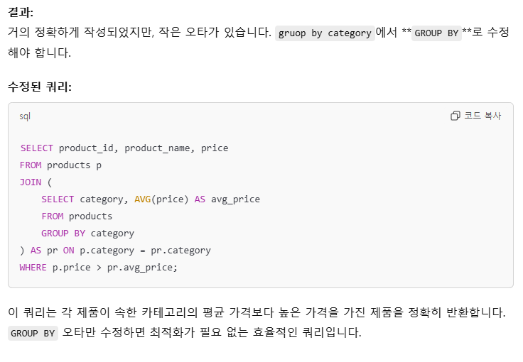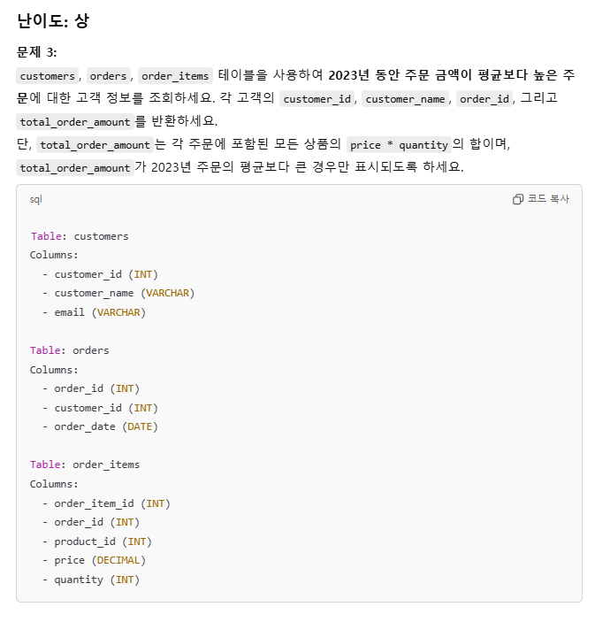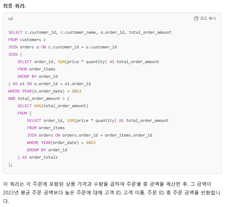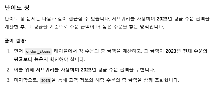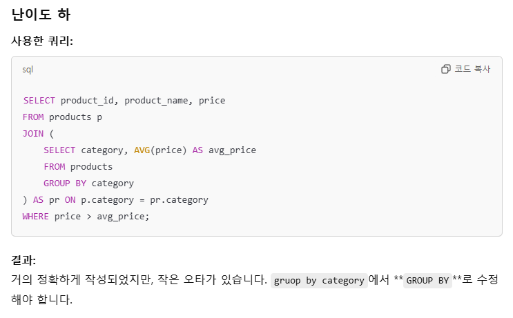 - 난이도 상 문제는 너무 어려워서 GPT가 내주는 답만 캡쳐해놨다. 서브쿼리 두개,, 아직 이 정도를 이해할 수 있는 실력까지는 되지 못하는 거 같다. 더 공부해야겠다