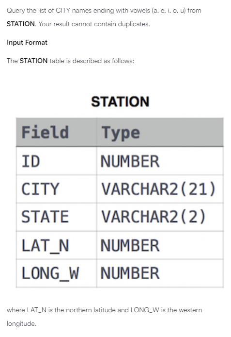 1. city 이름을 출력하되 모음으로 끝나야 함